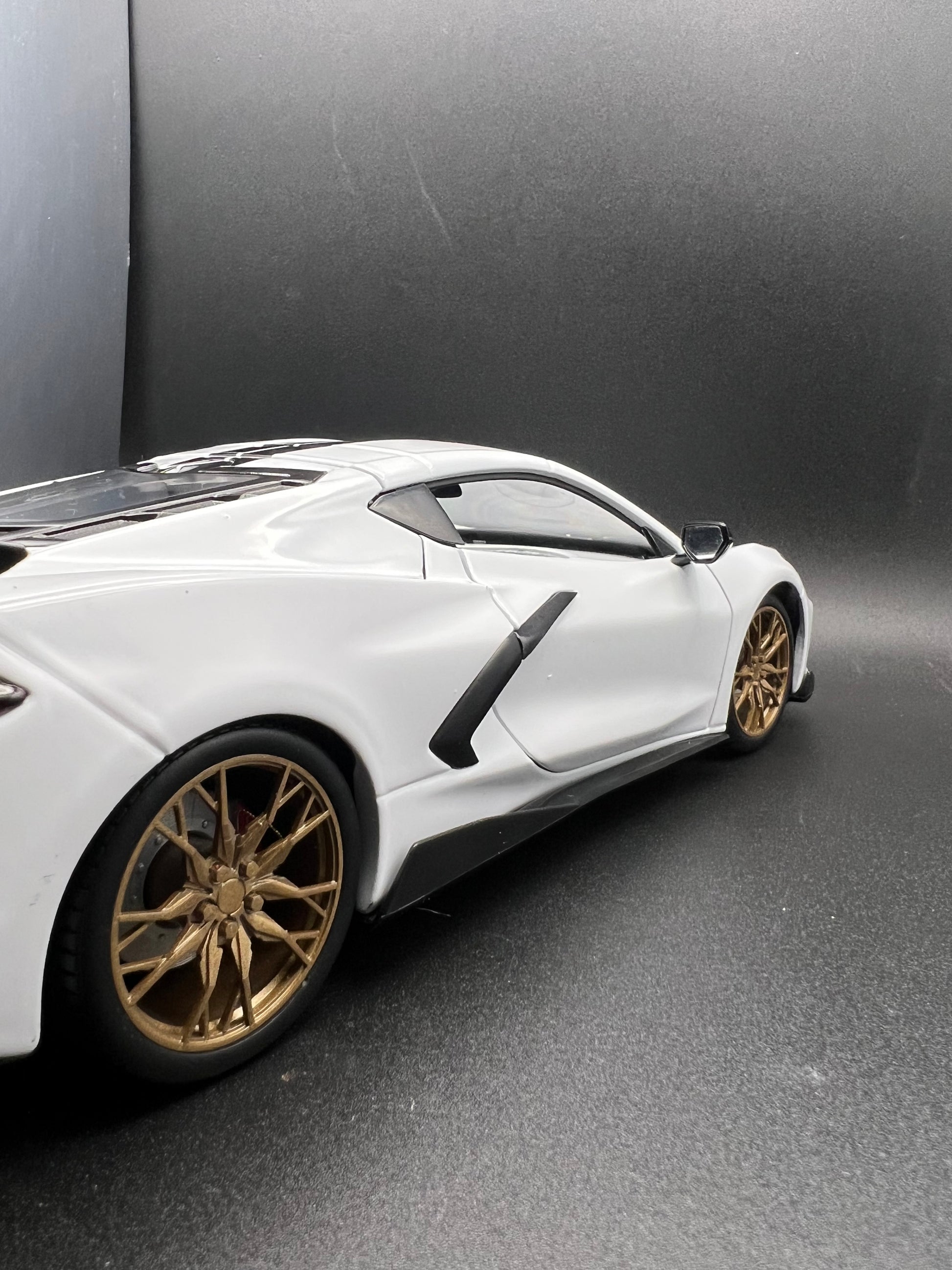 This is a direct-fit custom wheel set designed specifically for the Maisto 1:18 scale 2020 Corvette C8 diecast model. These wheels are not generic 1:18 rims — they are modeled to match the factory tire size, hub depth, and brake clearance of this exact car for a clean, realistic upgrade. The set installs using the original Maisto tires and brake components with no modification required. Designed for collectors and custom builders who want improved realism without guesswork. This wheel set is exclusive to this model and currently not available anywhere else.